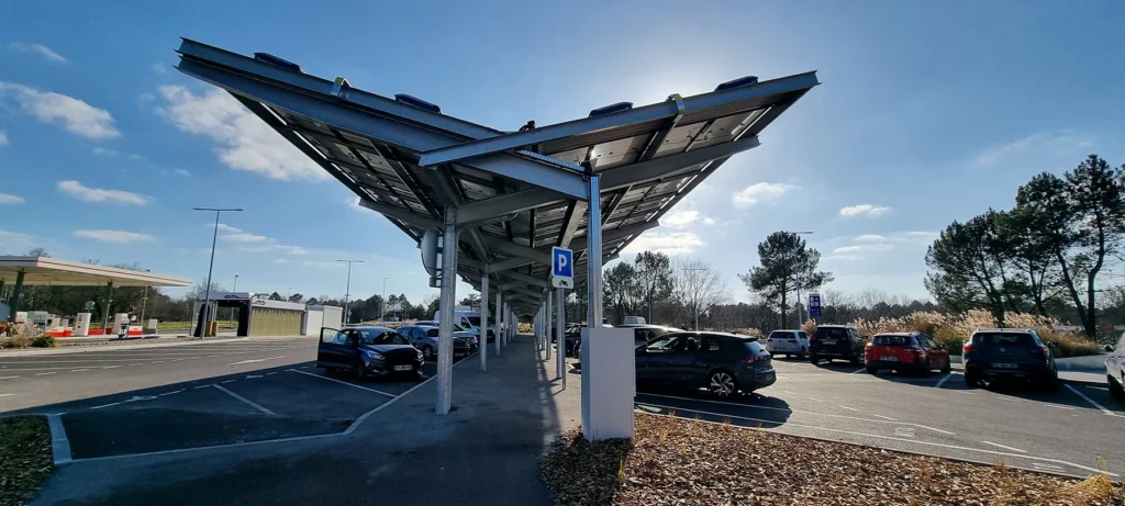 Construction de deux ombrières pour une aire d’autoroute. Charpente métallique : 24,5 Tonnes